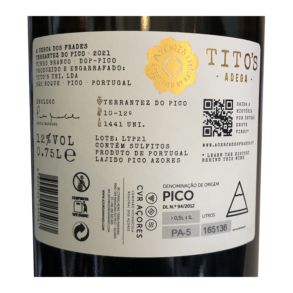 Diese 750ml Flasche A Cerca dos Frades - Weißwein, ist ein Weißwein aus Açores in Portugal von Tito's Adega.