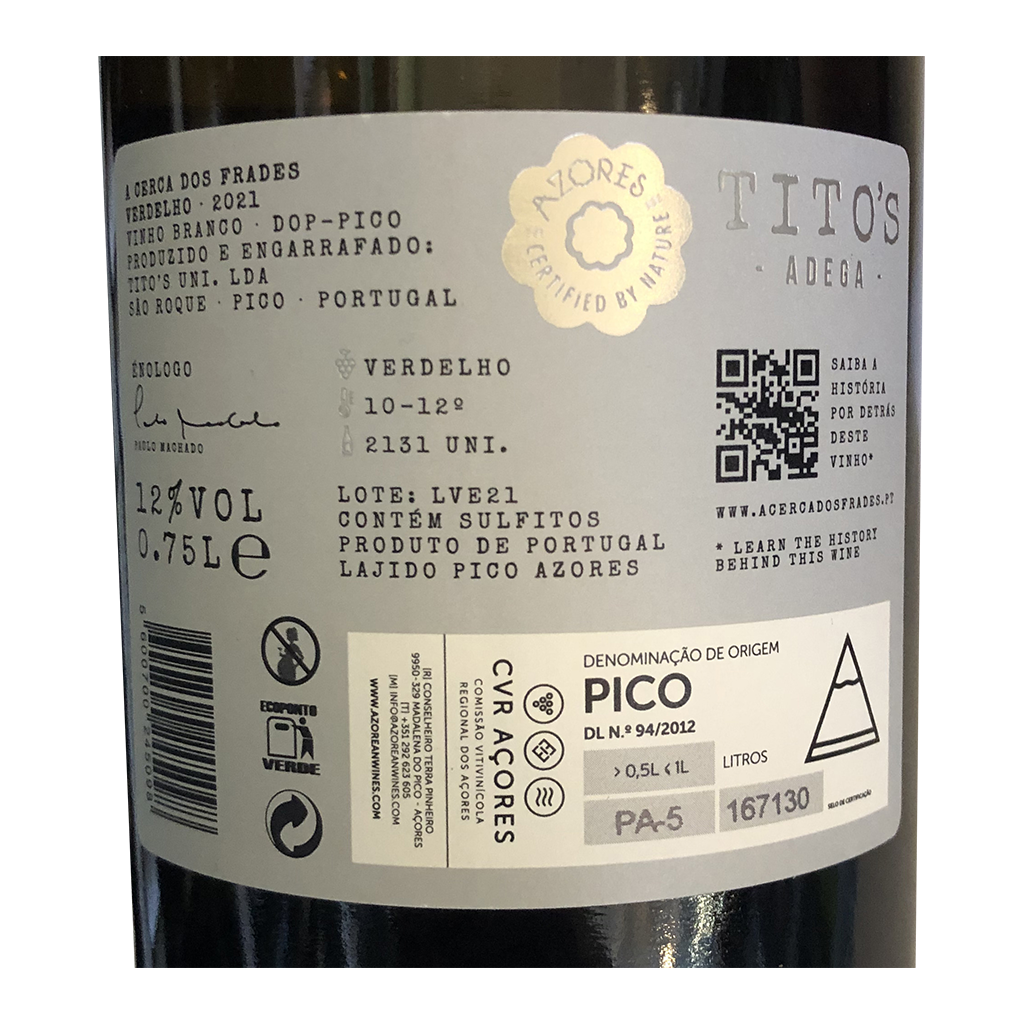 Diese 750ml Flasche A Cerca dos Frades - Weißwein, ist ein Weißwein aus Açores in Portugal von Tito's Adega.