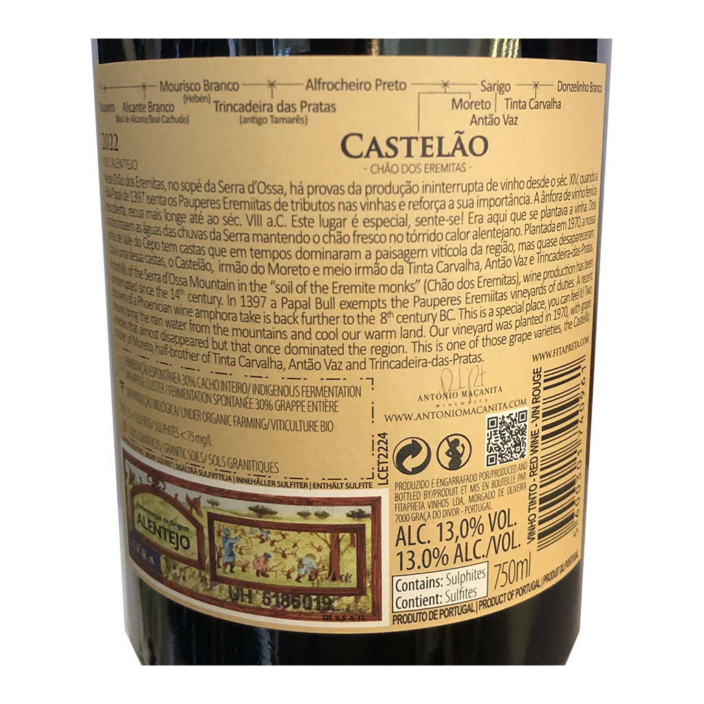 Diese 750ml Flasche Chão dos Eremitas Moreto - Rotwein, ist ein Rotwein aus Alentejo in Portugal von Fita Preta.