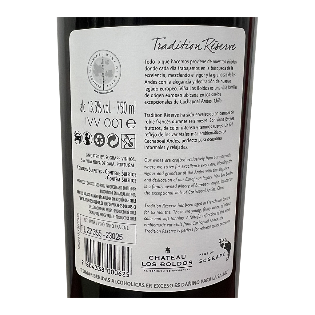 Der Chateau Los Boldos Tradition Carmenere ist ein herausragender Rotwein, der in der Region Cachapoal hergestellt wird und ein wahrer Beweis für die Qualität und Tradition der Weinherstellung ist.