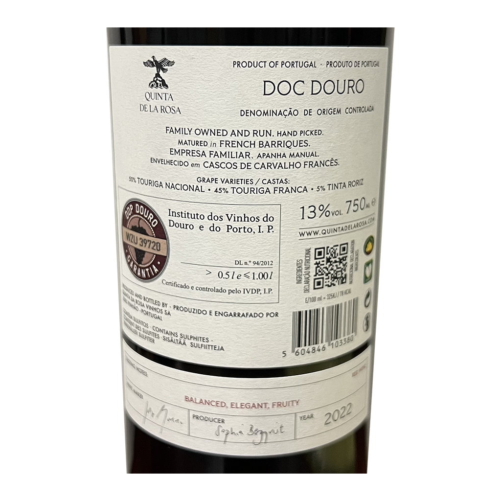 Quinta de La Rosa Rot ist eine harmonische Mischung aus traditionellen Portweinsorten, hauptsächlich Touriga Nacional und Touriga Franca, mit einem kleinen Anteil an Tinta Roriz, Sousão und alten Weinbergen. Dieser Douro-Rotwein ist bestrebt, den Trauben den Ausdruck in der Flasche zu ermöglichen, indem er ein Gleichgewicht zwischen Extraktion, Tannin und Eiche aufrechterhält. Das resultierende Produkt ist ein reichhaltiger und vollmundiger Wein, der dank einer guten Säure und Mineralität dennoch Frische und Lebendigkeit behält.